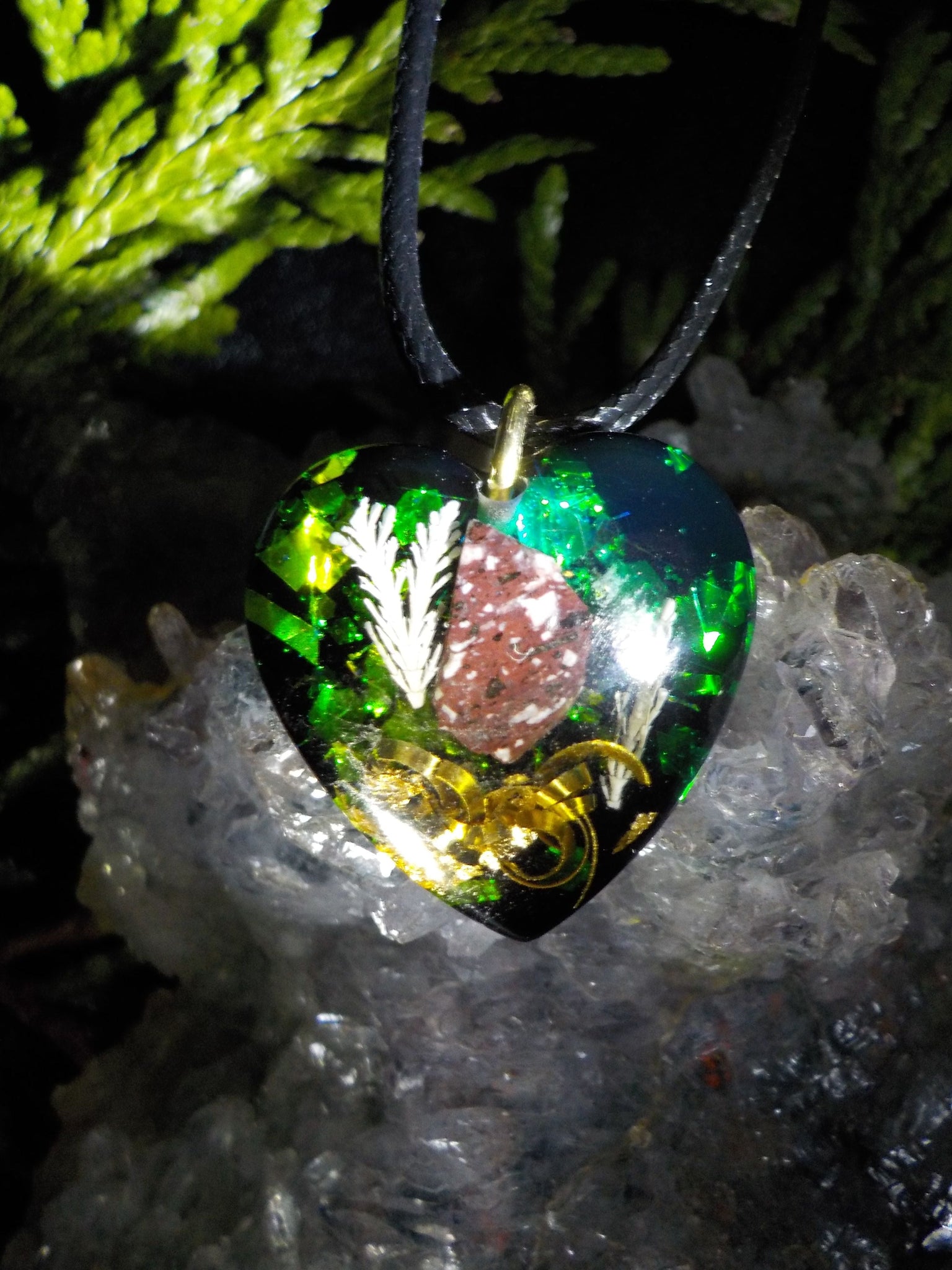 Pendentif orgonite en porphyre impérial, cristal de roche, bronze et feuilles dorées.