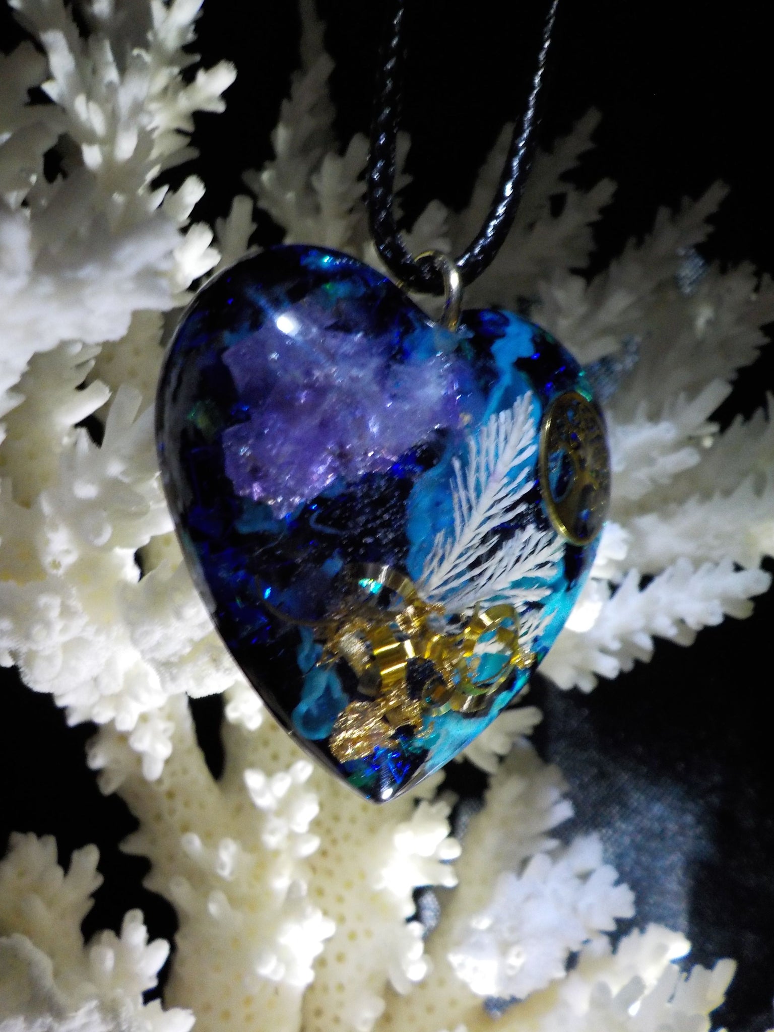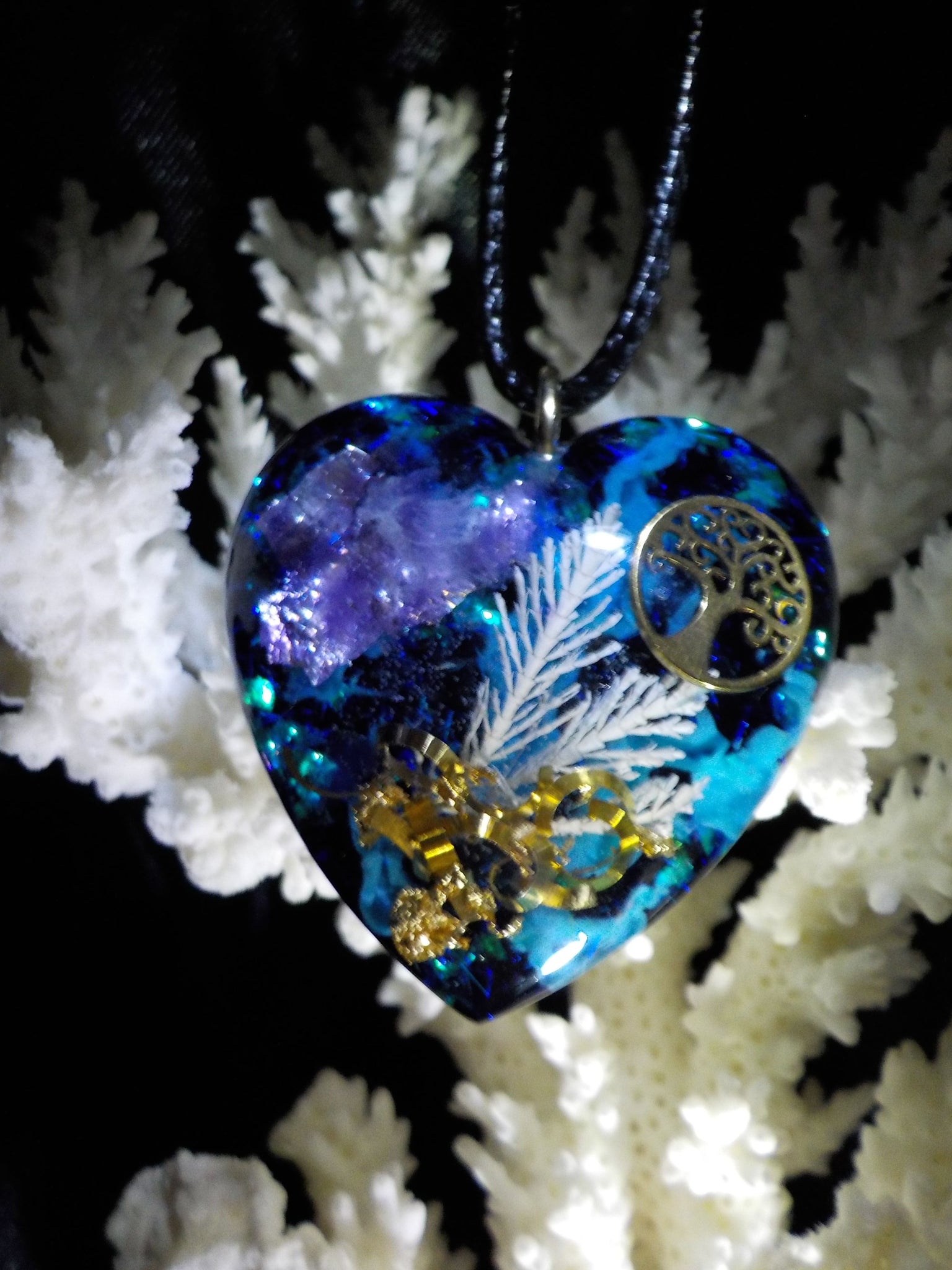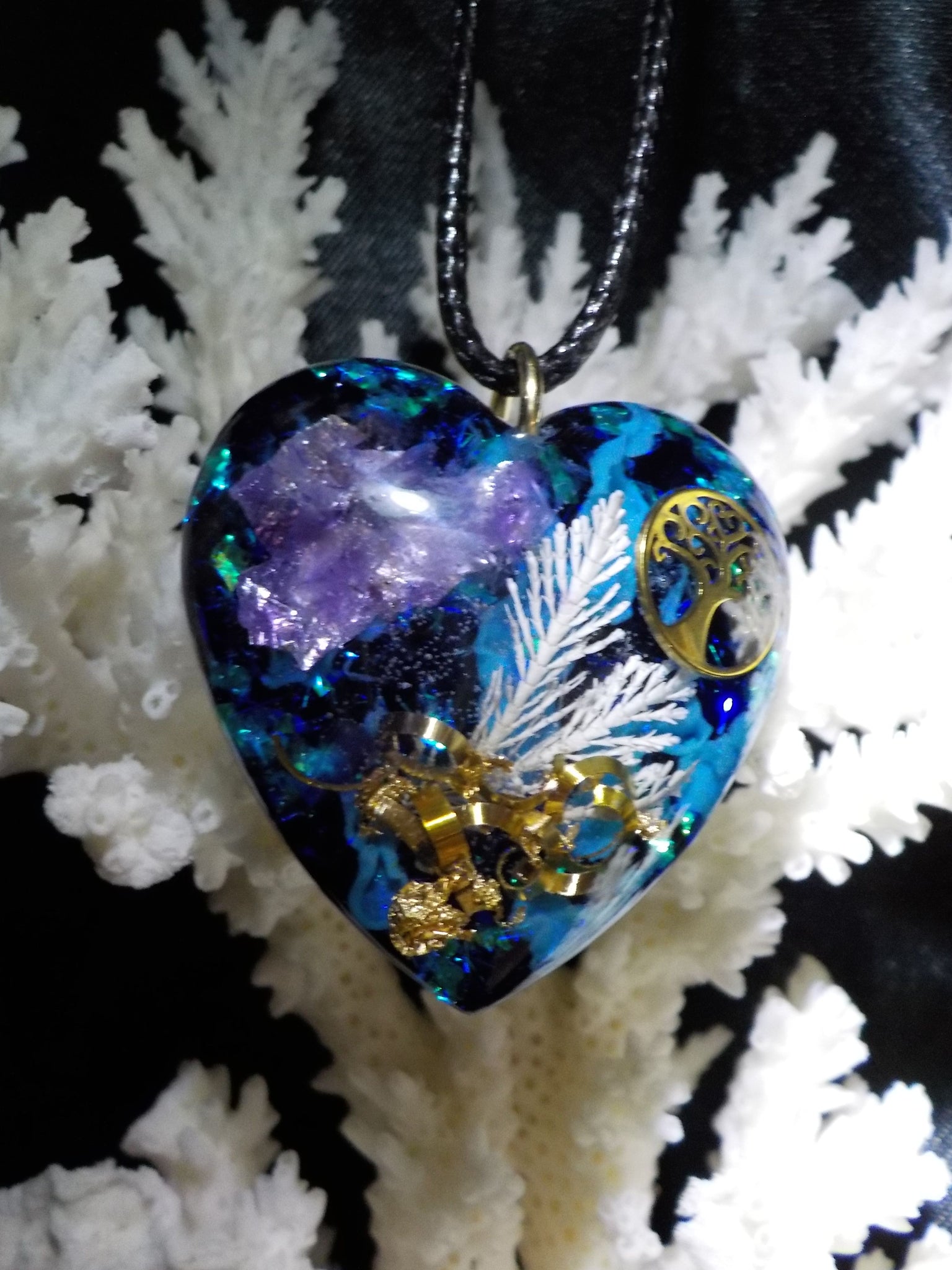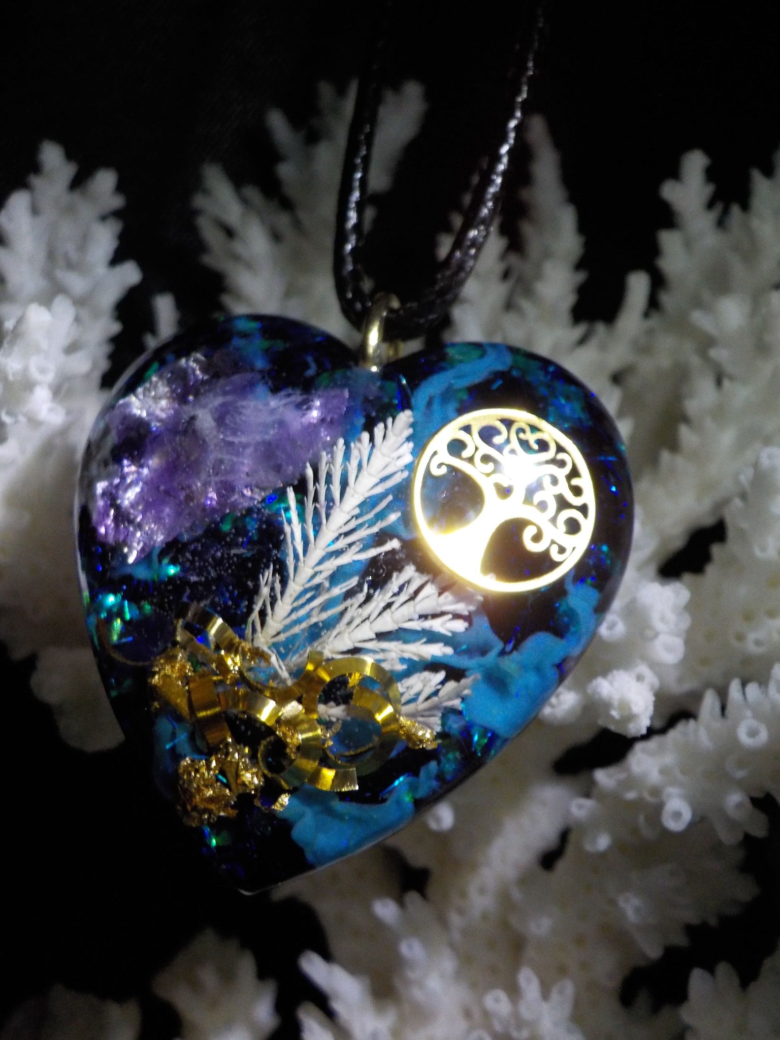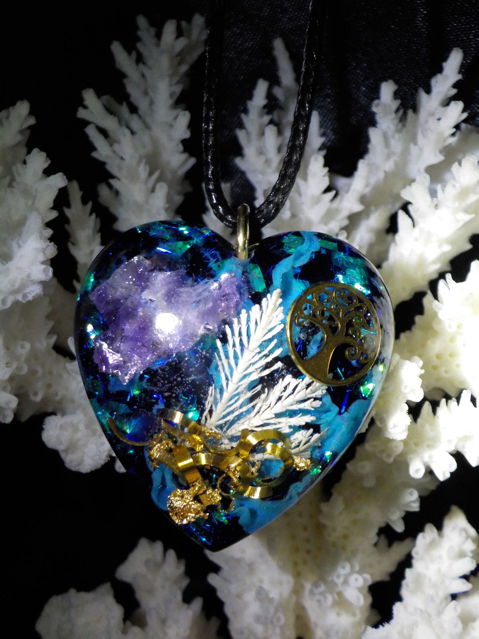 Pendentif orgonite en améthyste, arbre de vie, cristal de roche, bronze et feuilles dorées.