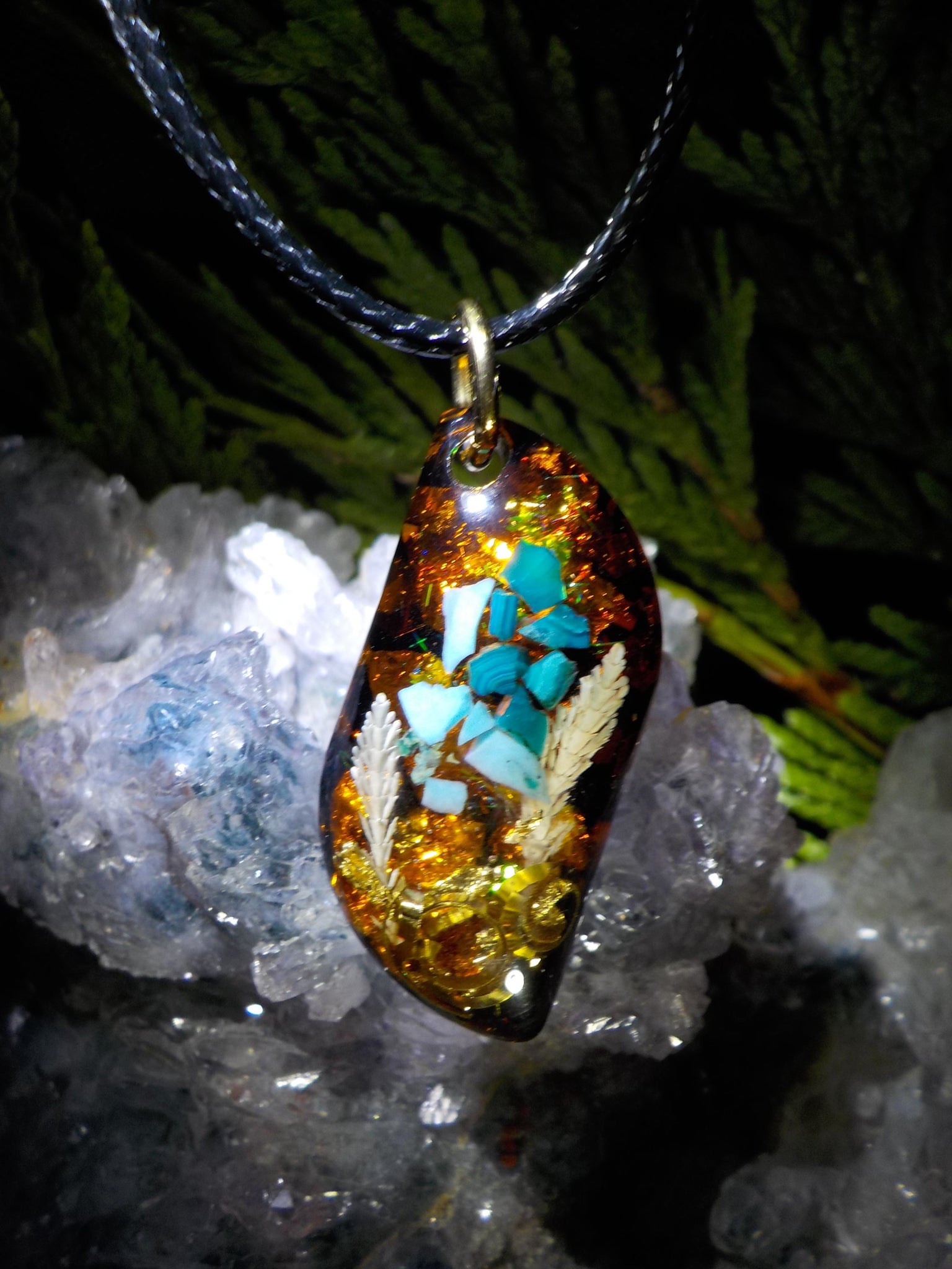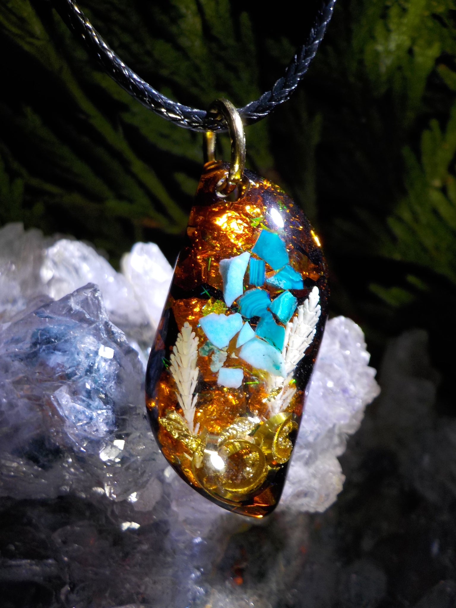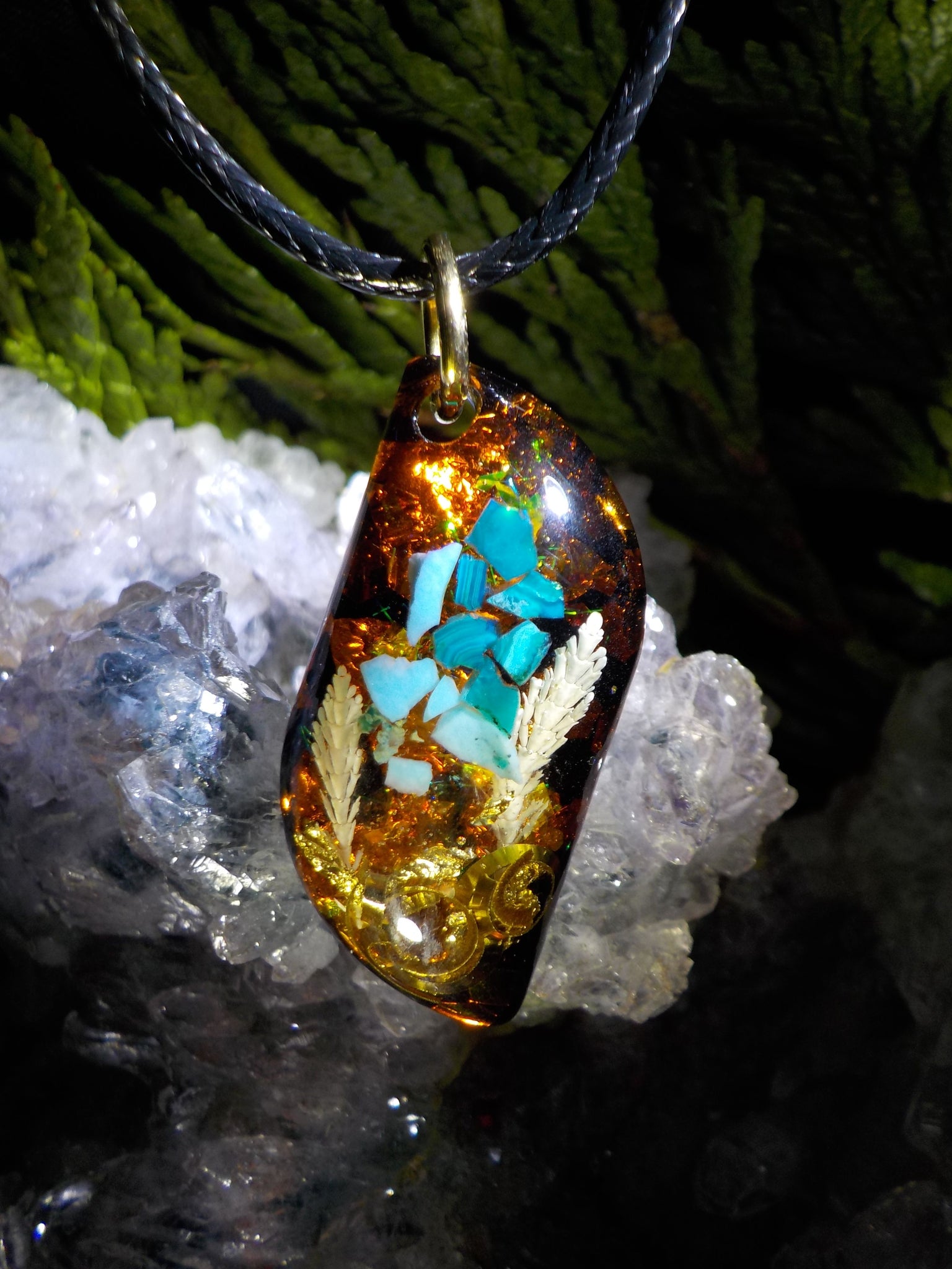 Pendentif orgonite en chrysocolle, turquoise, cristal de roche, bronze et feuilles dorées.